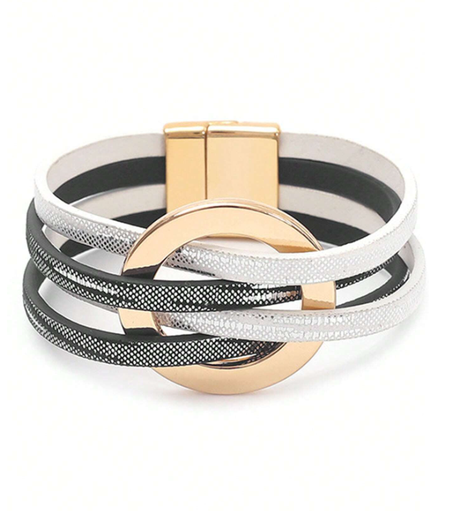 1 Braccialetto da donna in stile europeo e americano, in pelle PU a più strati, con grande anello rotondo in lega e chiusura magnetica, nero e bianco