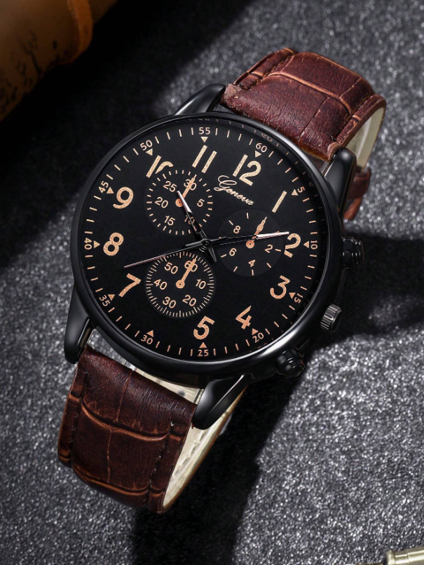 Orologio da uomo, set da 4 pezzi, cinturino in pelle sintetica marrone